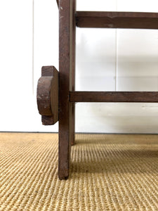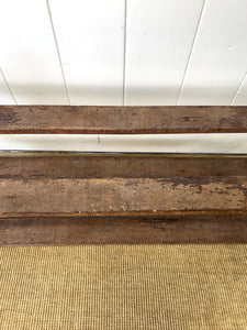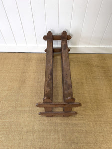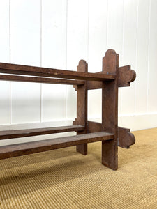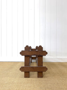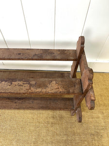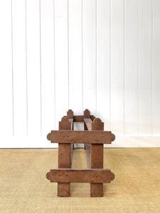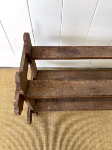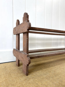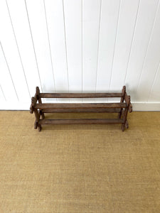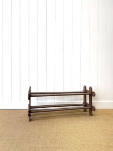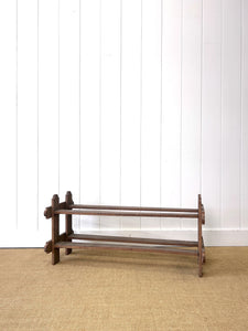 A charming and useful French pine shoe rack. Good old timeworn surface. Two shelves with rustic finish. Imported from England. Sturdy for everyday use, but a bit wobbly when rocked back and forth.
