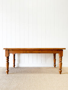 A beautiful vintage English pine dining table. This table has a nice figured top and beautifully turned legs. A good honey pine color. Solid and secure and ready for the family to dine at for years to come! Heirloom. Imported from England.