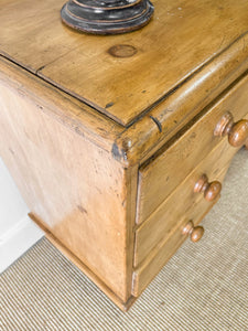 Condition: scratches, dents, marks, stains on top, dark stains in drawers, splits, cracks, top board is uneven, possibly reattached/replaced hardware, possibly replaced feet, possibly reattached feet, worn spots, discoloration, historical repairs (see top right side drawer front) - beautiful patina!