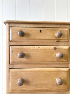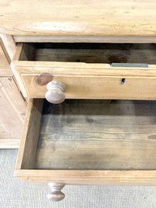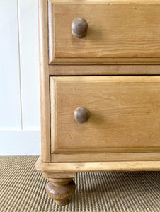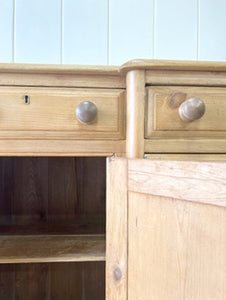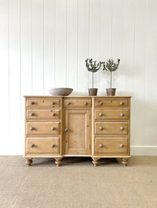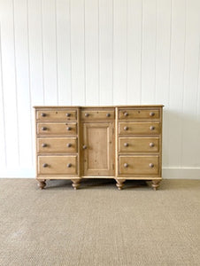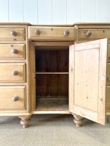 A charming English pine sideboard c1890. Having 2 banks of drawers on either side and delightfully chunky wooden knobs. A bleached, or very light pine color. Tulip feet, nine drawers total, and the front door opens for more storage space. A nice thick top and a beautiful paneled door and sides. Dovetail construction. Lovely softly waxed finish.